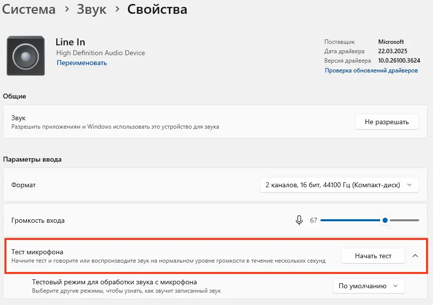 – «Параметры» → «Звук» → «Тест микрофона» – скажите что-нибудь и проверьте, движется ли индикатор.
