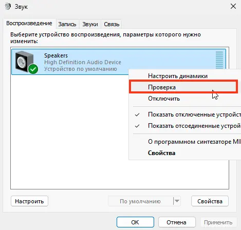 – «Панель управления» → «Звук» → вкладка «Воспроизведение» → выберите устройство → «Проверка».
