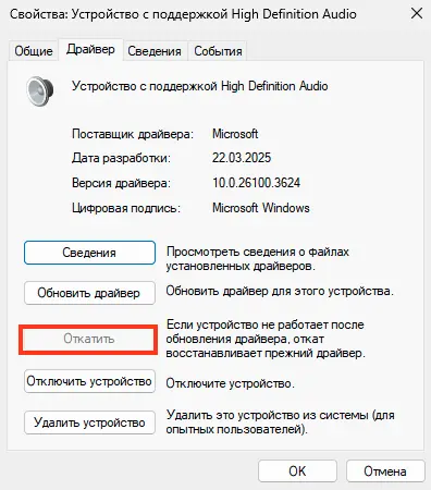 4. Если проблема началась после обновления, попробуйте «Откатить драйвер».