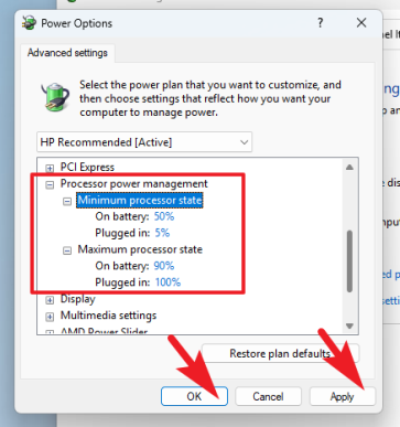 Когда вы уменьшаете «Максимальное состояние процессора», система использует только 90 процентов мощности процессора. Это помогает контролировать температуру процессора.