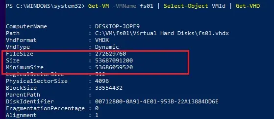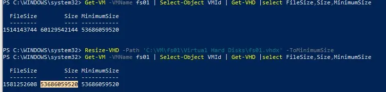 Resize-VHD -Path ‘C:VMfs01Virtual Hard Disksfs01.vhdx’ -ToMinimumSize