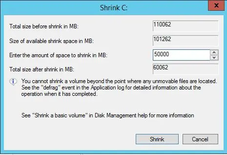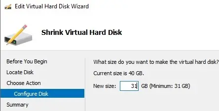 3. Укажите новый размер диска (например, с 40 ГБ до 31 ГБ). Размер не может быть меньше объема данных на диске.