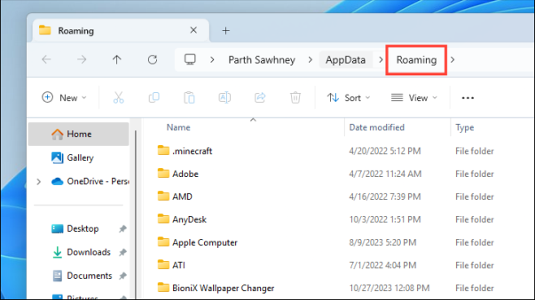Окно проводника откроется в подпапке «Роуминг» AppData. Чтобы получить доступ к другим подпапкам, нажмите «AppData» в адресной строке.