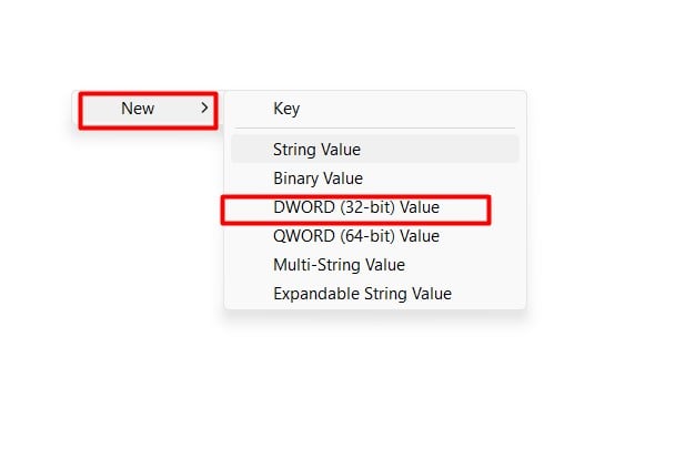 В системном интерфейсе щелкните правой кнопкой мыши и выберите опцию «Новый». В меню «Новое» нажмите «Значение DWORD (32-бит)». Это создаст файл «значение DWORD (32-бит)»: