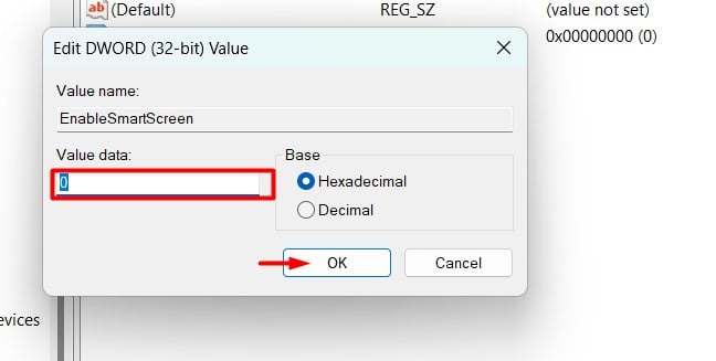 Измените значение с 1 на 0. 0 означает отключение, 1 означает включение. После изменения значения нажмите кнопку «ОК»: