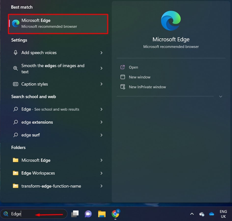 В меню «Пуск» введите и найдите «Microsoft Edge» и дважды щелкните по нему: