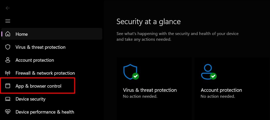 Нажмите опцию «Управление приложениями и браузером» на боковой панели безопасности Windows:
