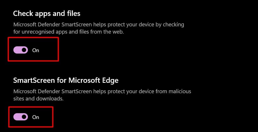 Отключите переключатель «Проверить приложения и файлы» и «Smart Screen для Microsoft Edge»: