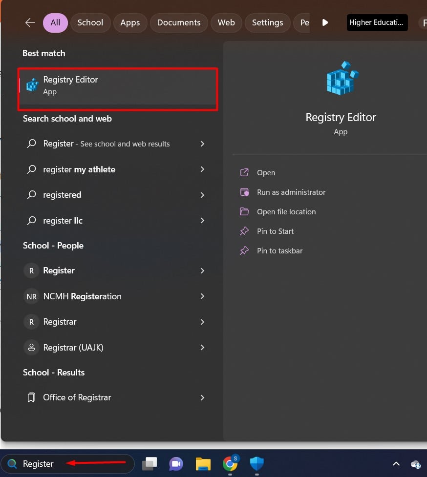 В меню «Пуск» введите и найдите «Редактор реестра» и дважды щелкните по нему: