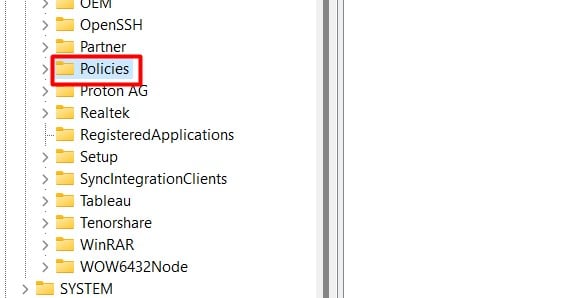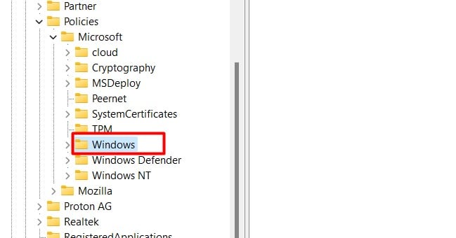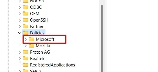 В папке «Политики» найдите и щелкните папку Microsoft: