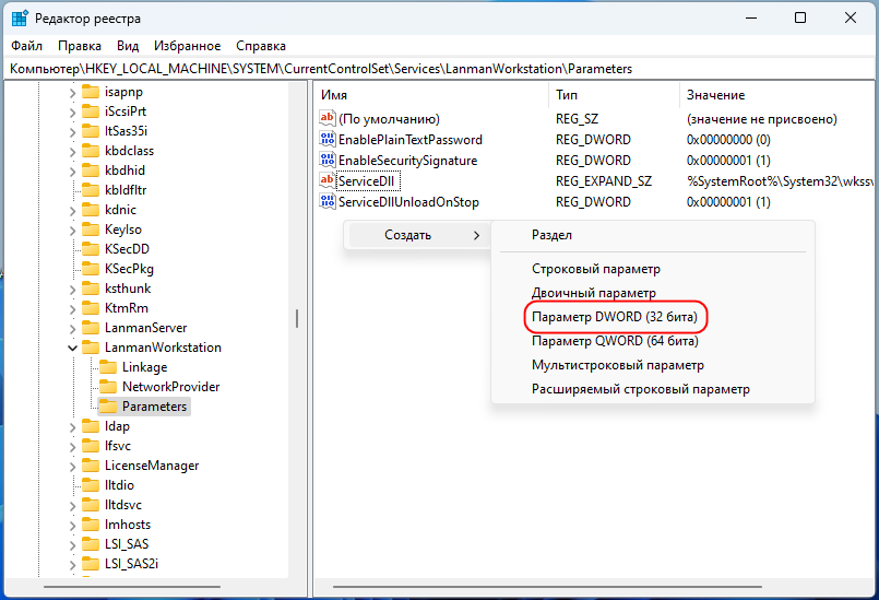 В правой колонке создайте новый параметр типа DWORD.