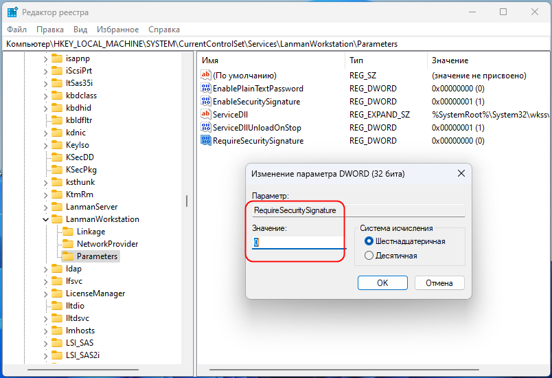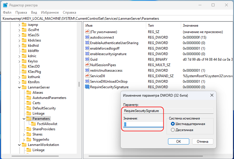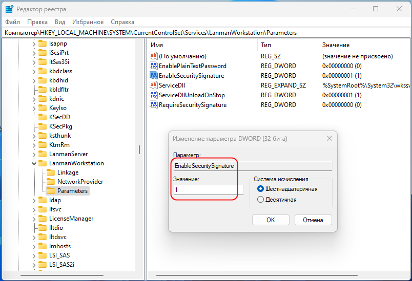 И наоборот, чтобы сделать его обязательным, в этом же разделе реестра создайте DWORD-параметр EnableSecuritySignature и установите в качестве его значения 1.