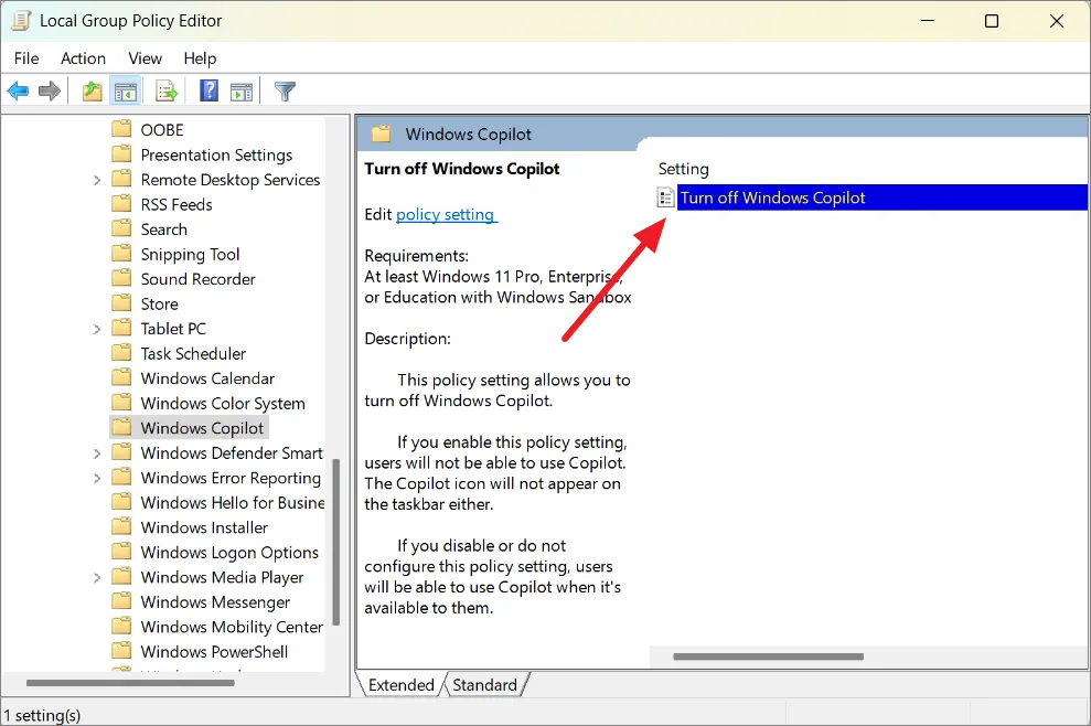 Если на вашем компьютере установлены версии Windows 11 Pro, Enterprise или Education, вы можете навсегда отключить Copilot в редакторе локальной групповой политики. Однако если вы используете Windows 11 Home Edition, у вас не будет доступа к GPE в вашей системе. Вы можете перейти к следующему способу — Редактору реестра.