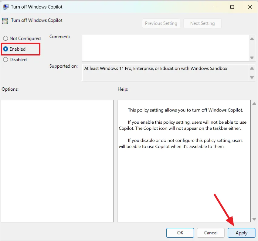 Чтобы повторно включить Windows Copilot, выполните те же действия и выберите «Не настроено» или «Отключено». Затем нажмите «Применить» и «ОК».