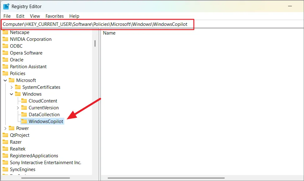 ComputerHKEY_CURRENT_USERSoftwarePoliciesMicrosoftWindowsНайдите каталог WindowsCopilot и дважды щелкните его. Если он отсутствует, вам необходимо создать его вручную, как описано в следующих шагах.