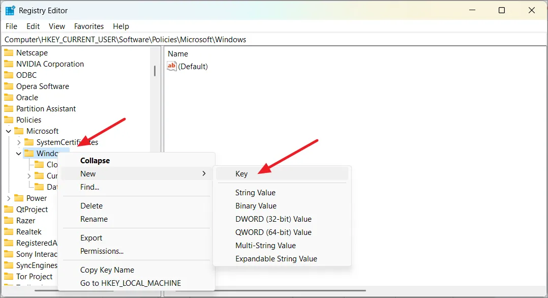 Чтобы вручную создать каталог «WindowsCopilot», щелкните правой кнопкой мыши каталог «Windows» на левой панели, нажмите «Создать» и выберите «Ключ».