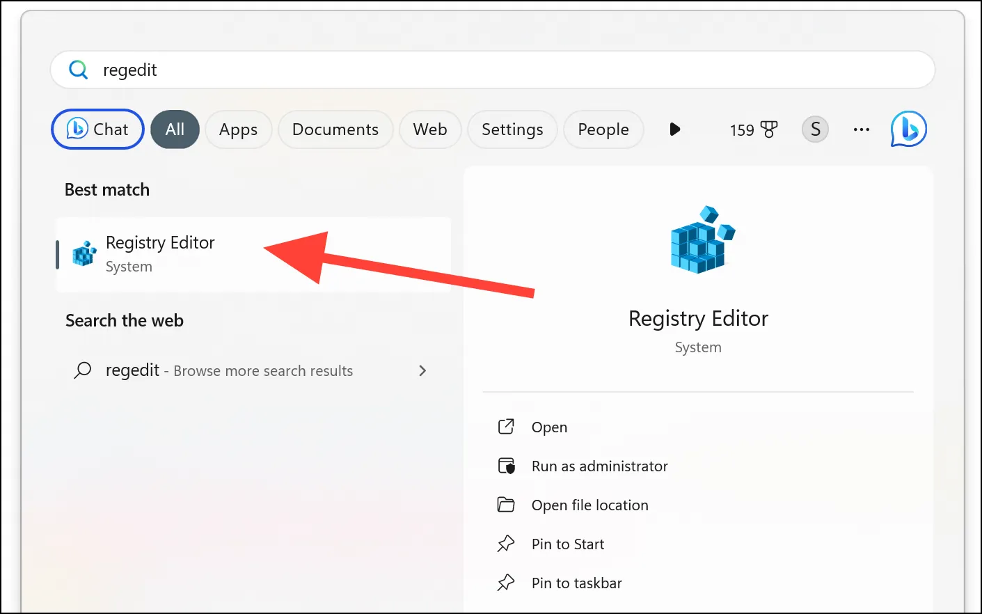 Введите regedit в меню «Пуск» и в результатах выберите «Редактор реестра».