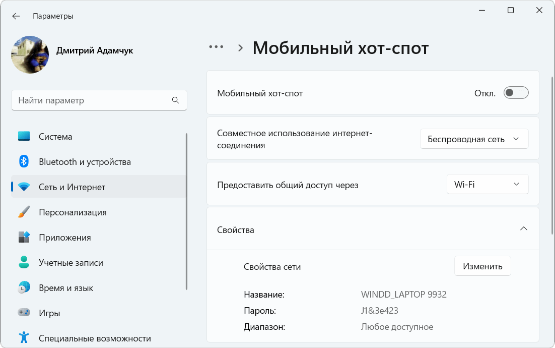 - Мобильный хот-спот Windows 11