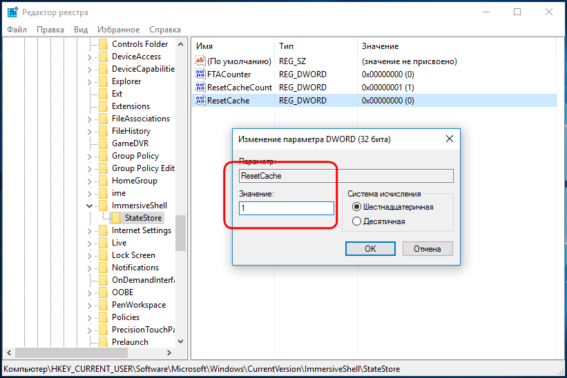 В последнем подразделе, правой колонке у вас должен быть DWORD-параметр ResetCacheCount. Его значение указывает на то, сколько раз был сброшен кеш для всех плиток. Скорее всего оно будет равняться единице. Чтобы сбросить кеш, в этом же разделе создайте новый 32-битный параметр типа DWORD, назовите его ResetCache и установите в качестве его значения 1, а затем перезапустите Проводник.