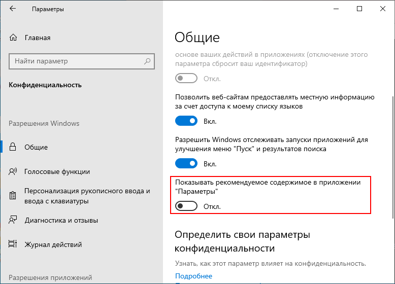 Чтобы его отключить, в приложении «Параметры» перейдите в раздел «Конфиденциальность и защита» → «Общие» и установите переключатель «Показывать рекомендуемое содержимое в приложении “Параметры”».