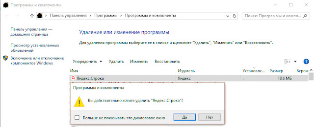 - Выберите в списке «Яндекс.Строка» и нажмите «Удалить»