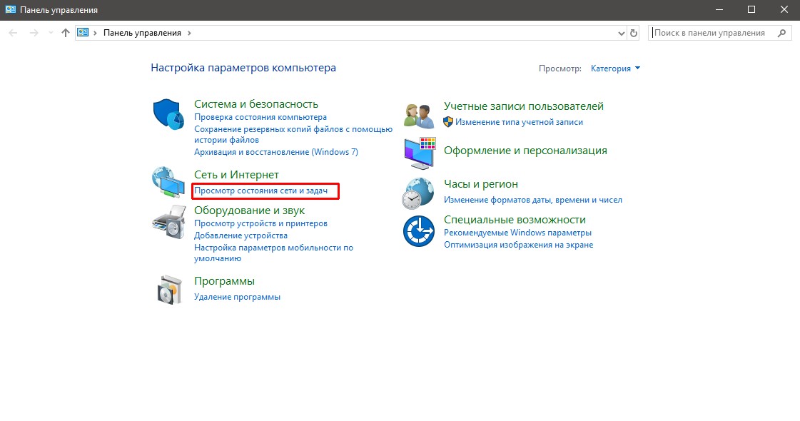 1. На главной странице «Панели управления» открываем элемент «Просмотр состояния сети и задач».