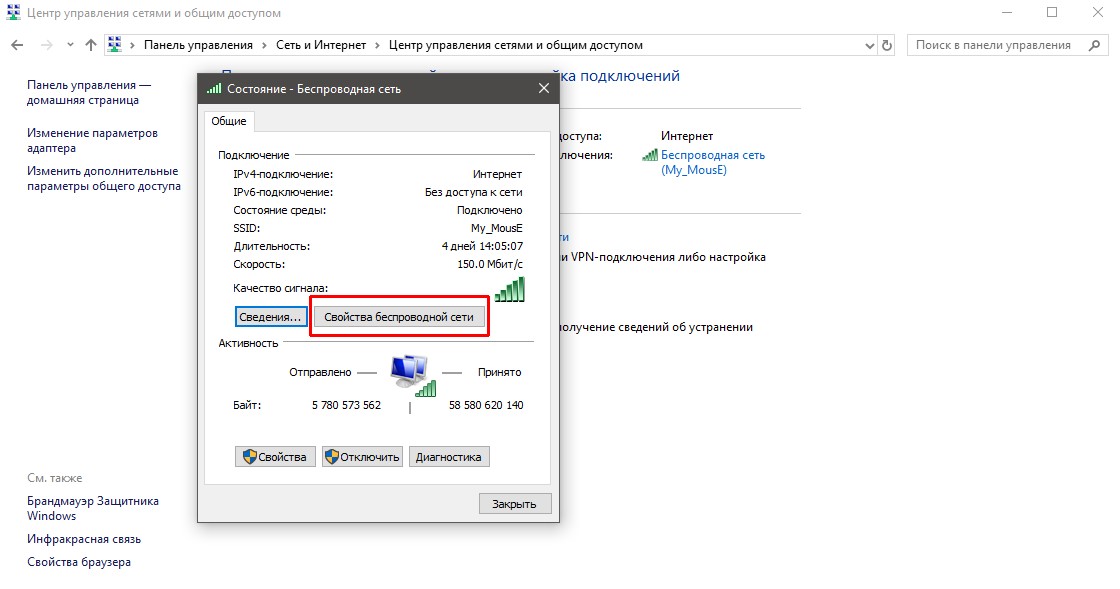 Кнопка «Свойства беспроводной сети» в окне «Состояние: Беспроводная сеть»
