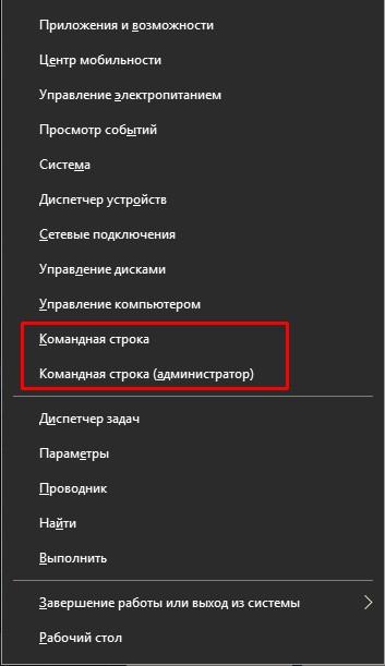 1. Нажимаем комбинацию Win + X, в выпавшем меню выбираем элемент «Командная строка». Для нижеописанных команд необязательны администраторские права, поэтому оба варианта запуска консоли подойдут.