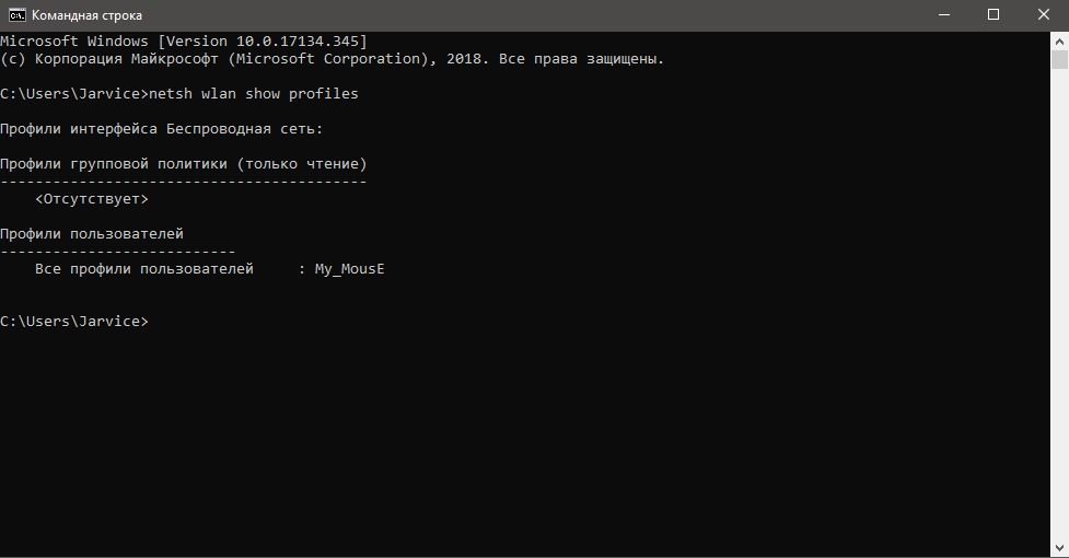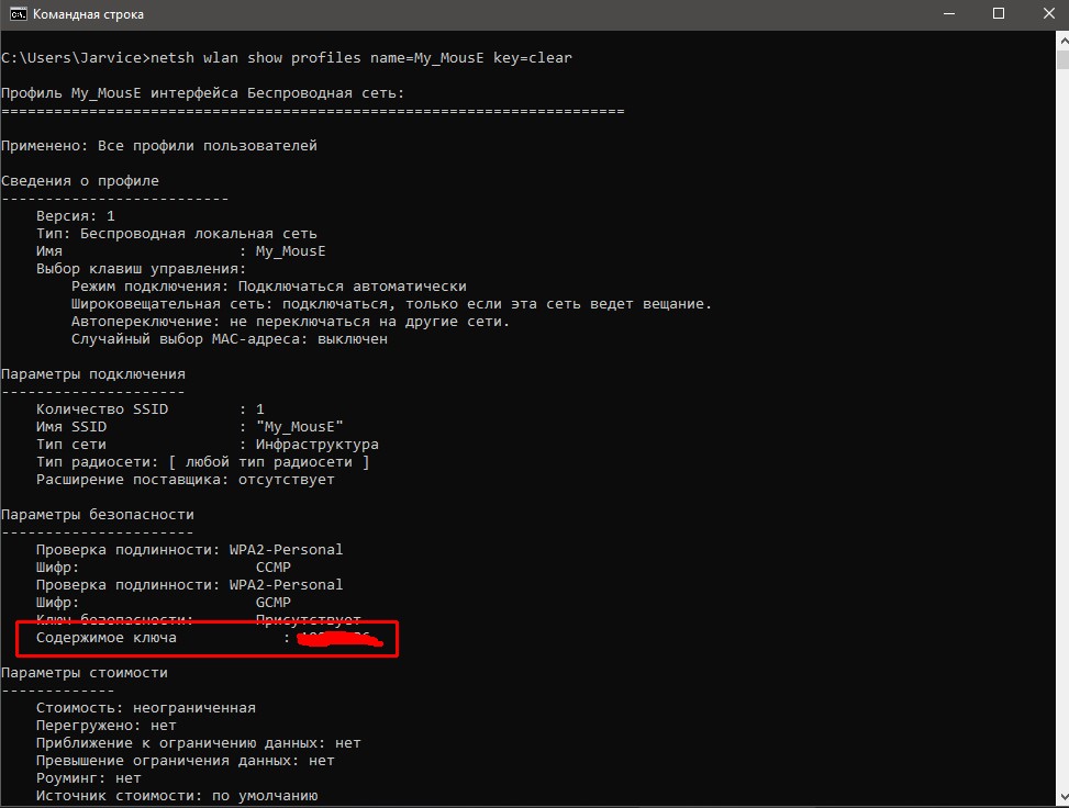 1. В терминале вводим netsh wlan show profiles name=My_MousE [необходимо вставить имя собственной сети] key=clear и нажимаем Enter.