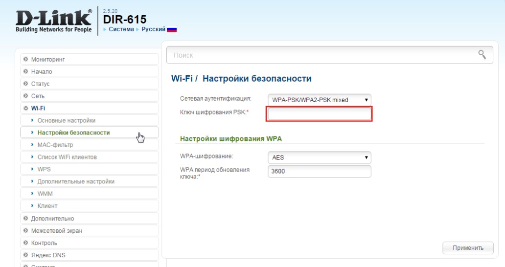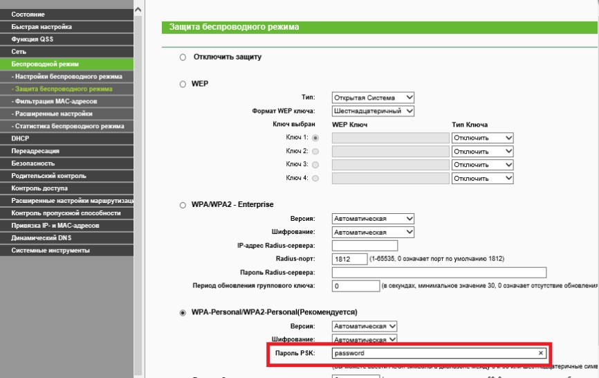 Пароль беспроводной сети хранится в поле «Пароль PSK»