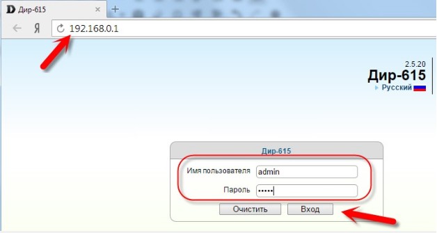 1. Чтобы открыть интерфейс управления роутером D-Link, в адресной строке вводим адрес 192.168.0.1. Если нужно ввести логин и пароль, пишем admin в обоих полях.