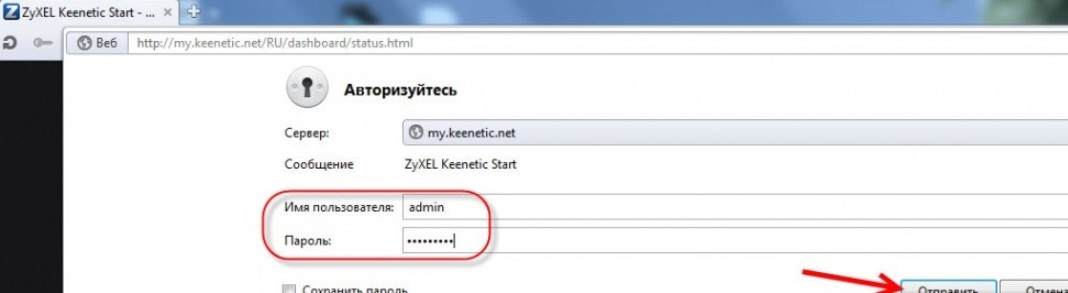 1. Для перехода в настройки ZyXEL в адресную строку вводим 192.168.1.1 или my.keenetic.net. В поле «Имя пользователя» пишем admin, а в поле «Пароль» — 1234.