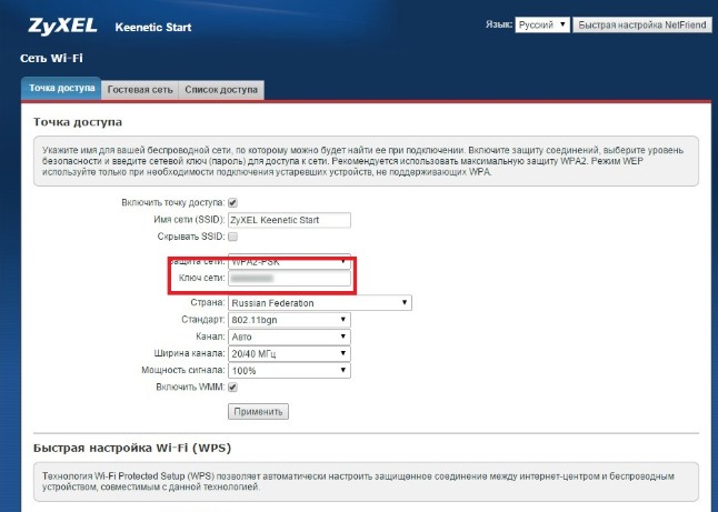 Во вкладке «Точка доступа» есть поле «Ключ сети», в котором прописан пароль с доступом к Wi-Fi