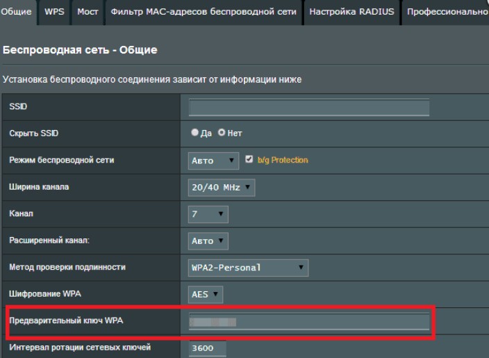 В «Общих» настройках есть поле «Предварительный ключ WPA», которое и хранит пароль