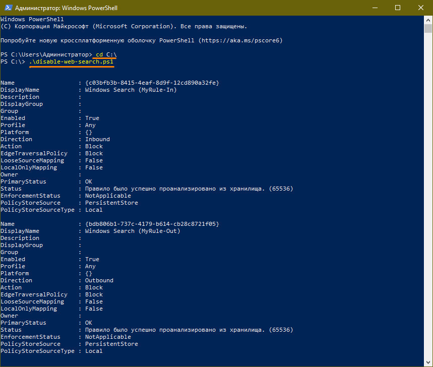 Обратите внимание на синтаксис, он отличается от синтаксиса запуска файлов в классической командной строке. В последней достаточно ввести имя файла с расширением, в PowerShell перед именем файла нужно добавить точку и слеш без пробела (./disable-web-search.ps1).
