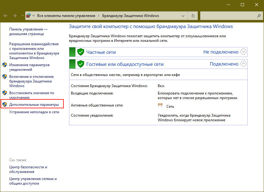 Если в будущем вы захотите отменить блокировку, откройте брандмауэр Windows и нажмите слева в меню ссылку «Дополнительные параметры».