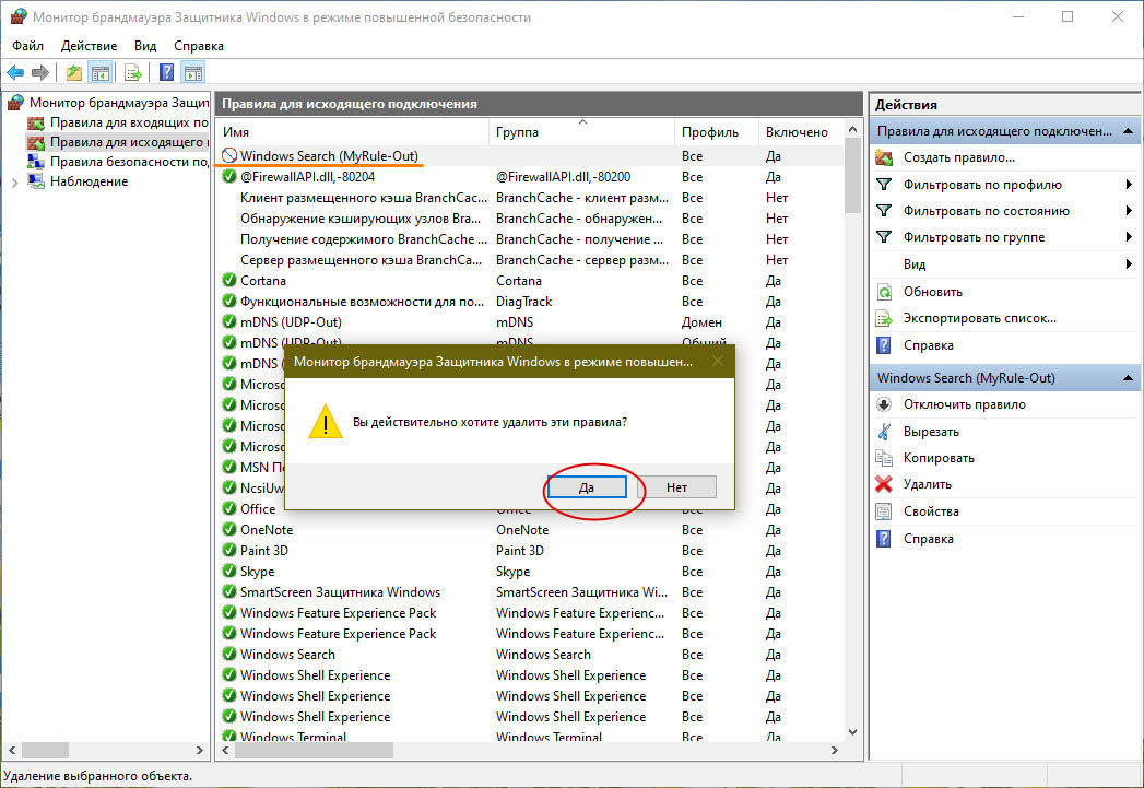 Выделите в открывшемся окне правила для исходящих подключений, найдите и удалите правило «Windows Search (MyRule-Out)».