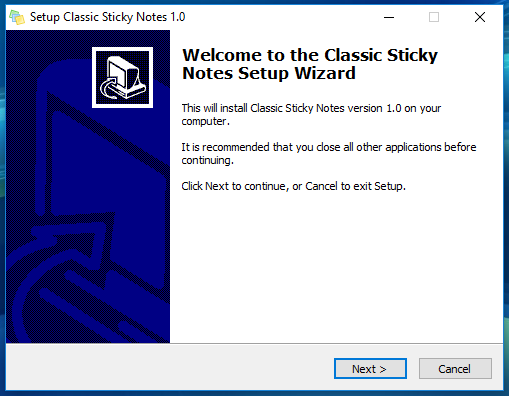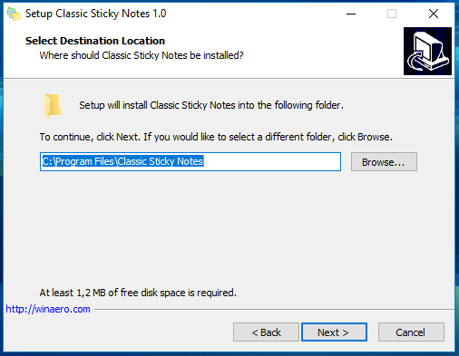 Если вы по какой-то причине недовольны работой нового Sticky Notes, можете без проблем вернуть его старую классическую версию. Скачайте по ссылке winaero.com/download.php?view.1940 оригинальный дистрибутив Sticky Notes и запустите исполняемый файл. Появится классическое окно мастера-установщика программ в Windows.