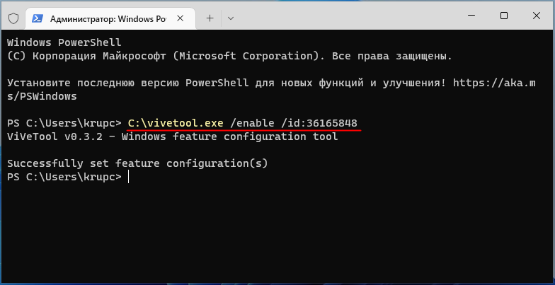 C:vivetool.exe /enable /id:36165848