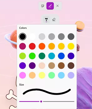 в подменю которого вам будут доступны простая палитра цветов, ластик и настройка изменения размера кисти.