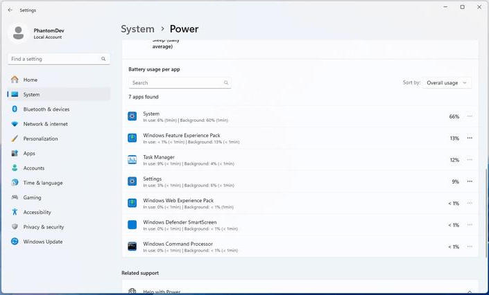 Если у вас ноутбук или другое мобильное устройство, наиболее интересным и полезным вам должно показаться изменение раздела «Использование батареи». В Windows 11 23506 он будет переименован в «Использование питания и батареи» (предварительно), но самое главное – в нем появится новая функция, отображающая данные об использовании заряда аккумулятора системой и разными приложениями – примерно так же, как это реализовано в ОС Android.