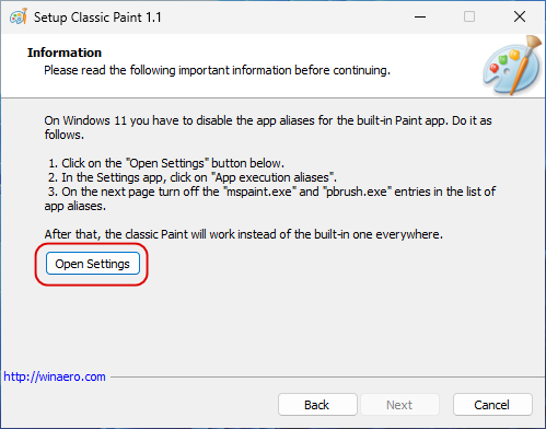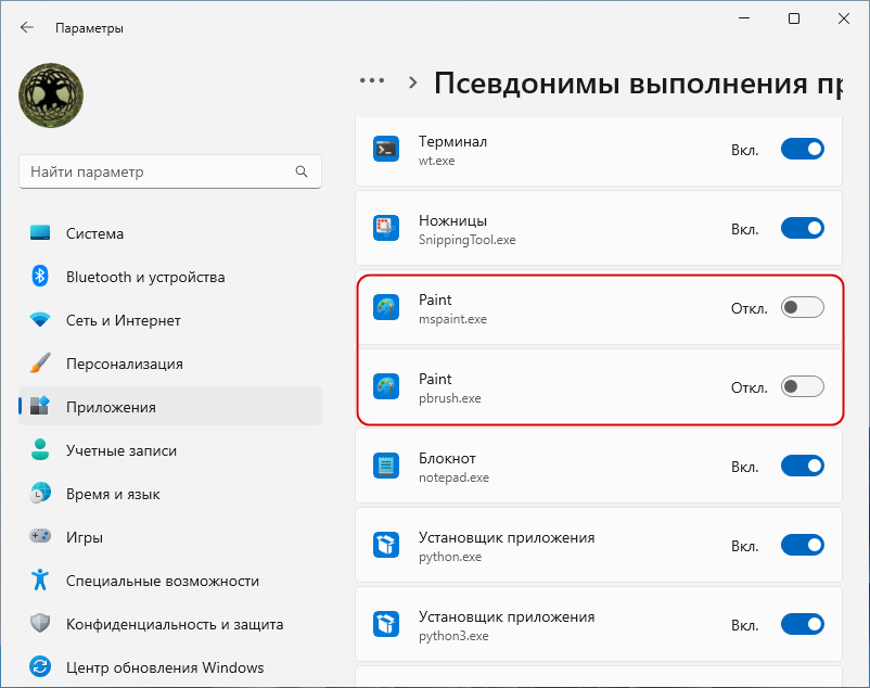 И отключите псевдонимы «Paint» для исполняемых файлов mspaint.exe и pbrush.exe.