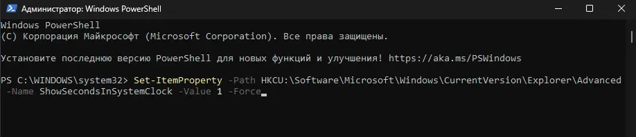 Set-ItemProperty -Path HKCU:SoftwareMicrosoftWindowsCurrentVersionExplorerAdvanced -Name ShowSecondsInSystemClock -Value 1 -Force