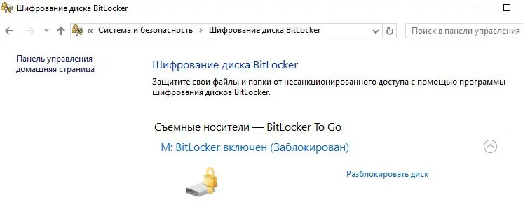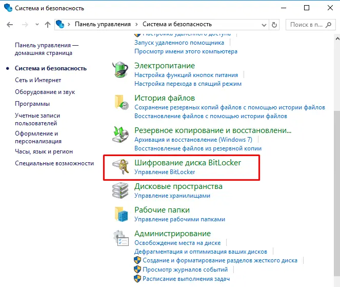 2. Откройте «Панель управления» -> «Система и безопасность» -> «Шифрование диска BitLocker»