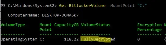 Get-BitLockerVolume -MountPoint «C:» | Select-Object VolumeStatus