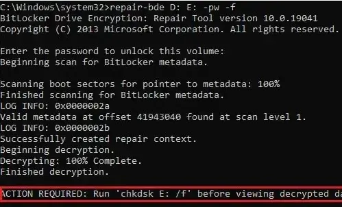 «Decrypting: 100% completed. Finished decryption. ACTION REQUIRED: run chkdsk E: /f before viewing decrypted data.»