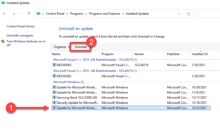 - Отсортируйте обновления по дате установки, щелкнув метку столбца «Установлено в». Выберите недавно установленные обновления и нажмите кнопку «Удалить» сверху. Кроме того, вы можете щелкнуть правой кнопкой мыши обновление и выбрать «Удалить».