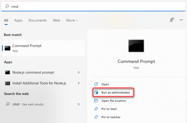 - Начните с запуска командной строки с повышенными правами. Откройте меню «Пуск» на панели задач, введите cmd и выберите «Запуск от имени администратора» на правой панели.