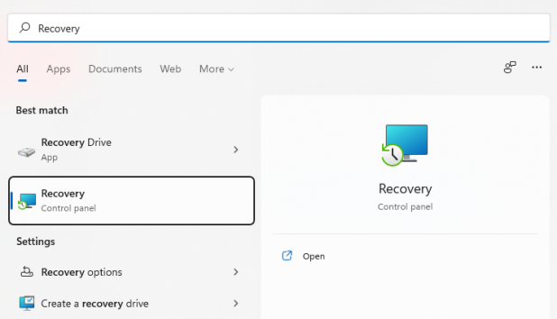 - Откройте меню «Пуск» на панели задач и найдите «recovery». Выберите Восстановление из результатов.