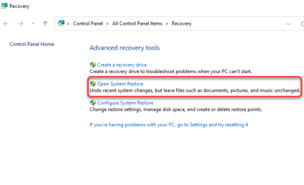- Выберите «Открыть восстановление системы».